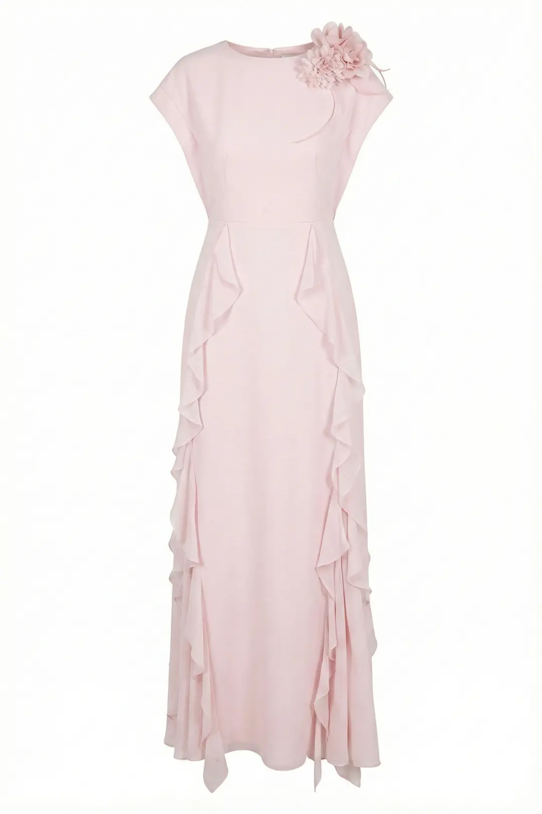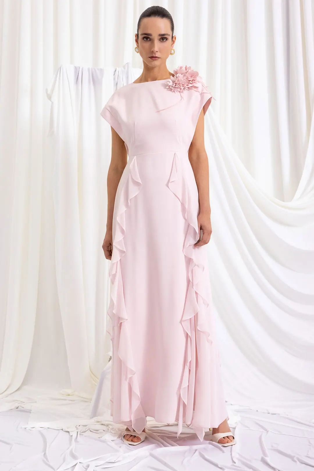 Romantik ve zarif tasarımıyla öne çıkan maksi abiye elbise, özel davet ve organizasyonlar için feminen bir siluet sunar. Omuz kısmında yer alan üç boyutlu çiçek aplikesi tasarıma sofistike bir dokunuş katarken, uçuşan volan detayları elbiseye akıcı ve hareketli bir görünüm kazandırır.