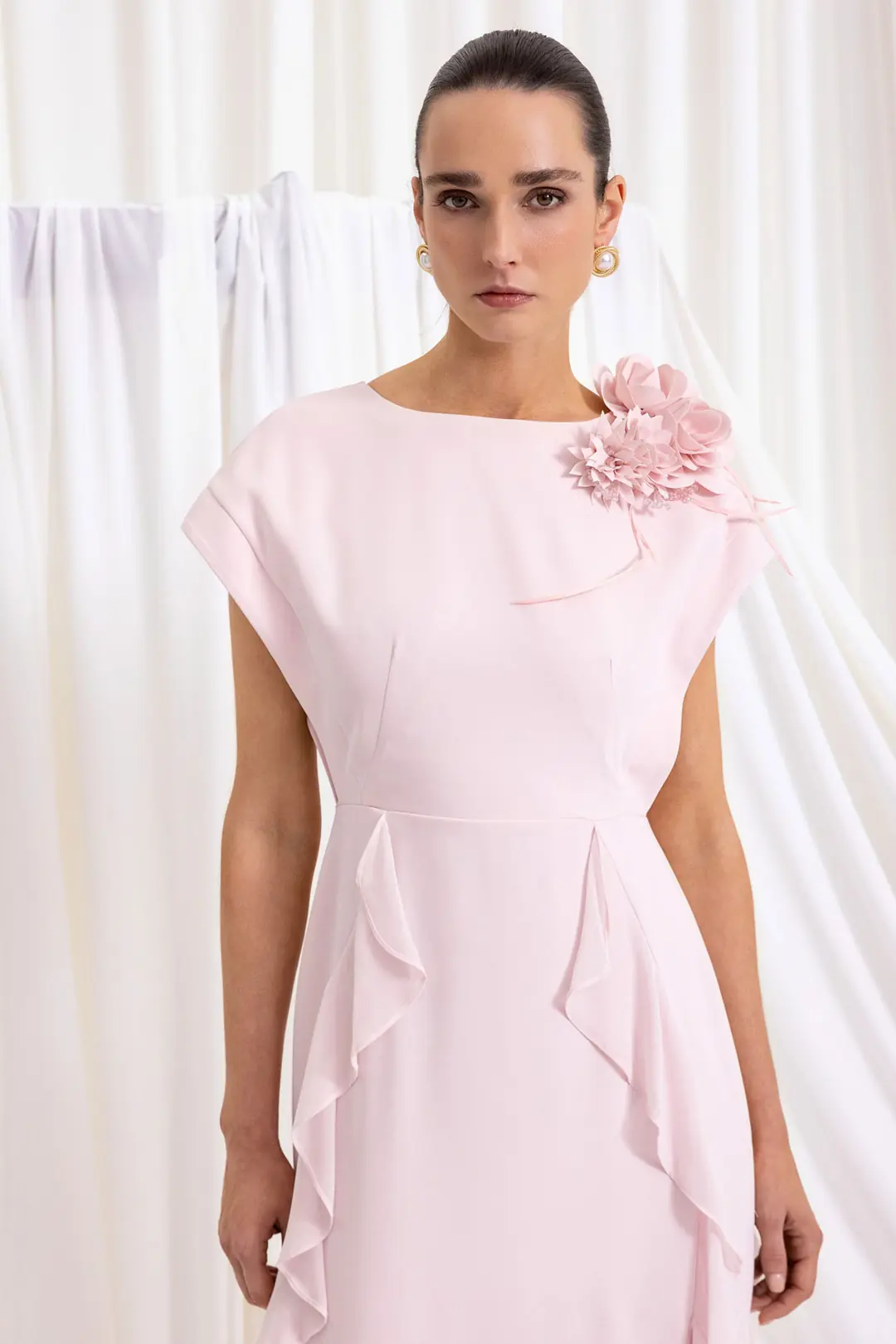 Minimal üst form ve bel hizasında dengeli kesim vücut hatlarını zarifçe vurgular. Etek boyunca uzanan katmanlı şifon volanlar, yürüdükçe romantik bir dalga efekti oluşturur. Hafif ve dökümlü kumaşı sayesinde hem konforlu hem de şık bir kullanım sunar.