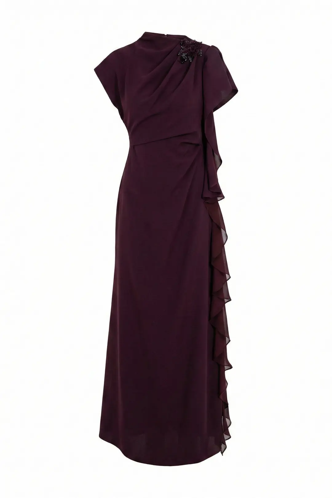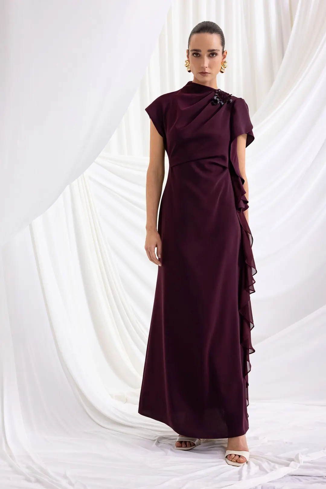 Zarafeti ve güçlü silueti bir araya getiren mürdüm drapeli uzun abiye elbise, özel davet ve gece organizasyonlarında etkileyici bir görünüm sunar. Akıcı ve dökümlü kumaşı vücut hatlarını nazikçe sararken, omuzdan başlayan drape detayı tasarıma sofistike bir hava katar.