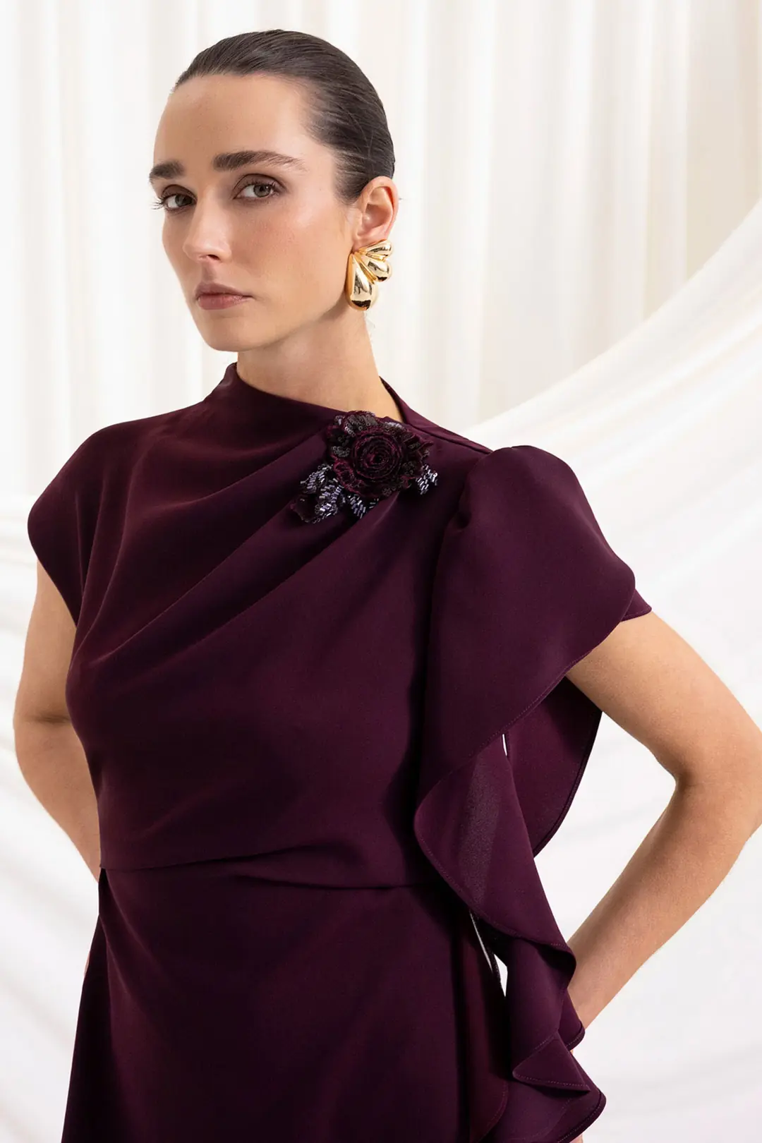 Yaka kısmındaki çiçek aplik detayı elbiseye zarif bir odak noktası kazandırırken, yan bölümde yer alan volanlı şifon katman hareketli ve feminen bir siluet oluşturur. Maxi boy kesimi sayesinde boyu uzun ve dengeli gösterir. Minimal aksesuarlarla kombinlendiğinde güçlü ve şık bir stil elde edilir.