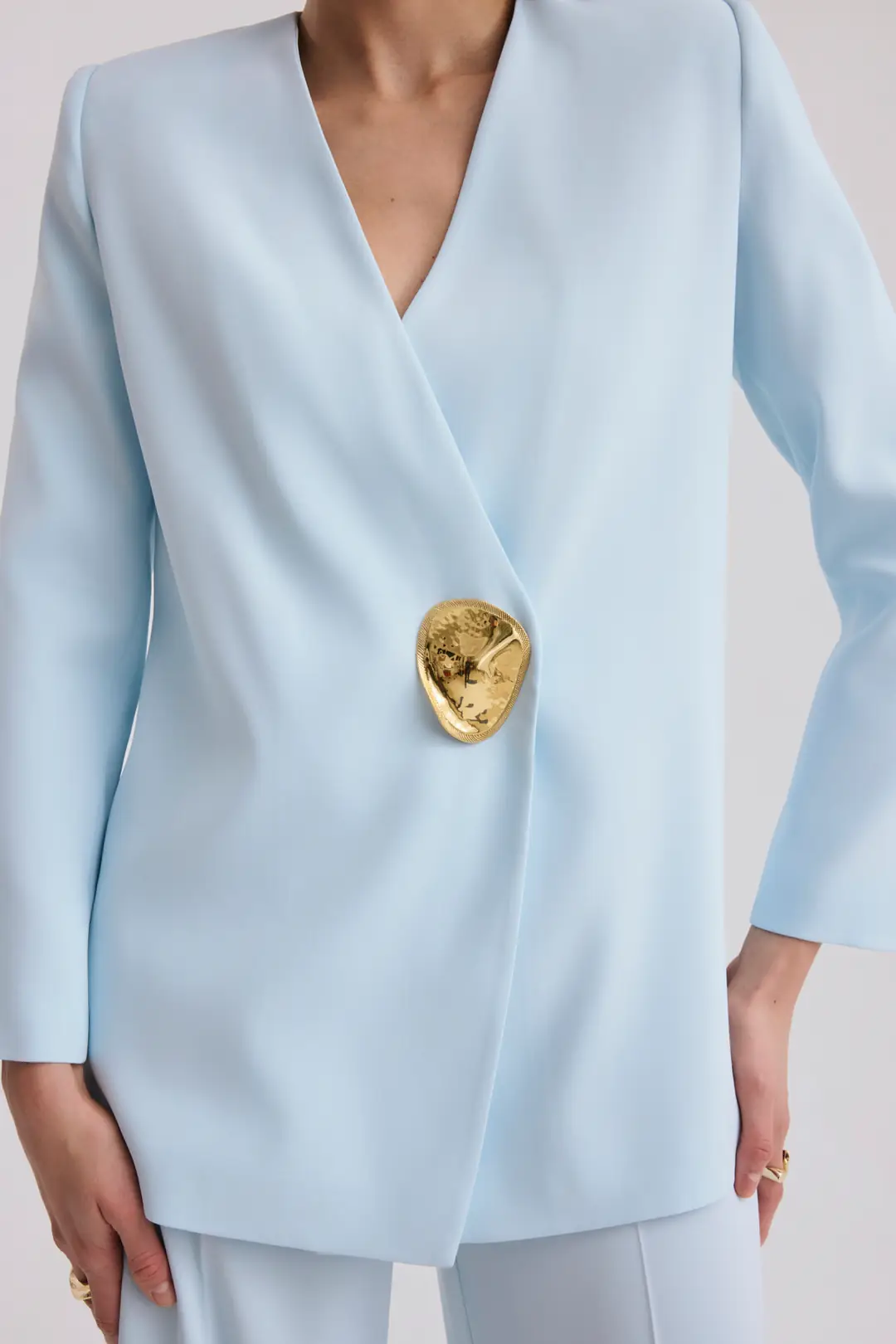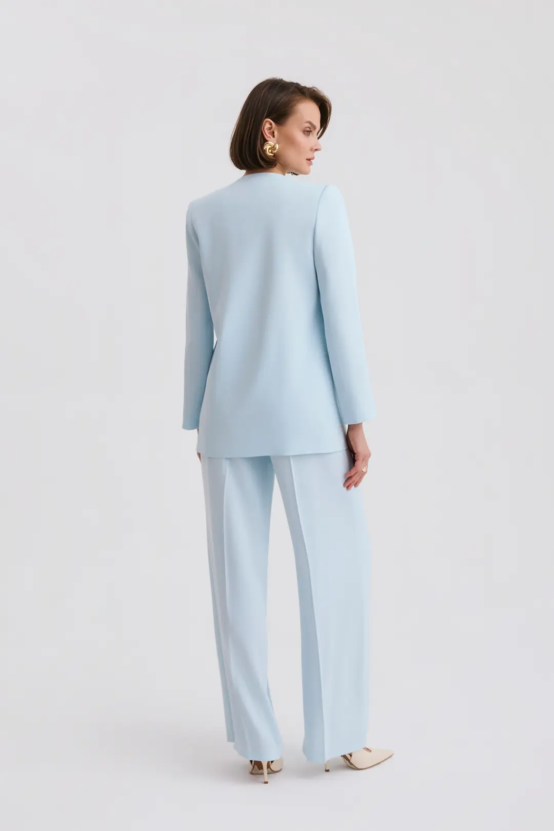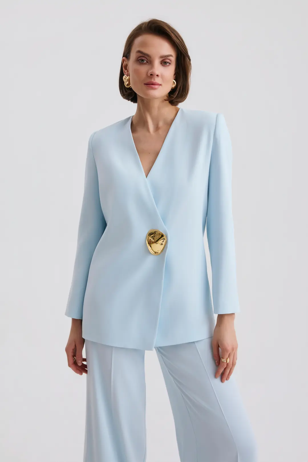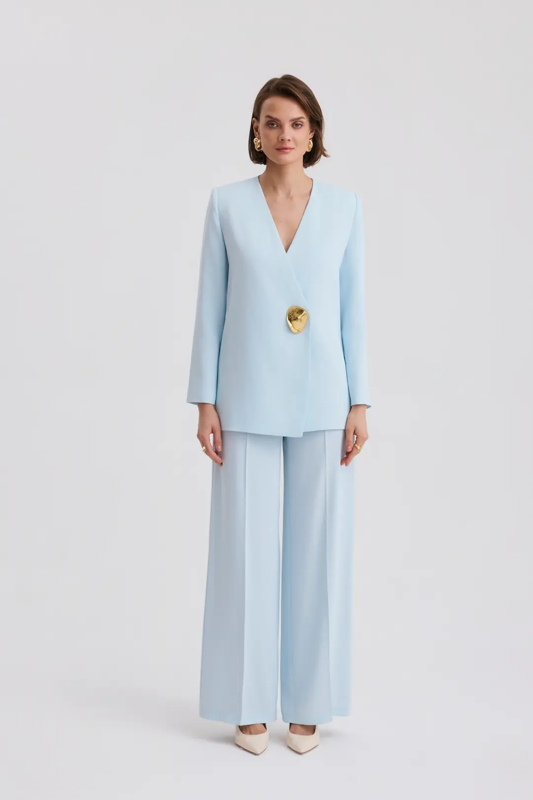 Zarif ve modern çizgileri bir araya getiren bu kadın takım, güçlü bir stil oluşturmak isteyenler için şıklığı ve konforu aynı tasarımda buluşturur. Minimal V yaka formu ve dikkat çekici metal aksesuar detayıyla tasarlanan ceket, sofistike bir görünüm sunarken; akıcı kesimli pantolon ise silueti dengeli ve zarif bir şekilde tamamlar. Günlük şıklık, ofis kombinleri ve özel davetlerde rahatlıkla tercih edilebilecek bu takım, modern kadın stilini güçlü bir şekilde yansıtır.