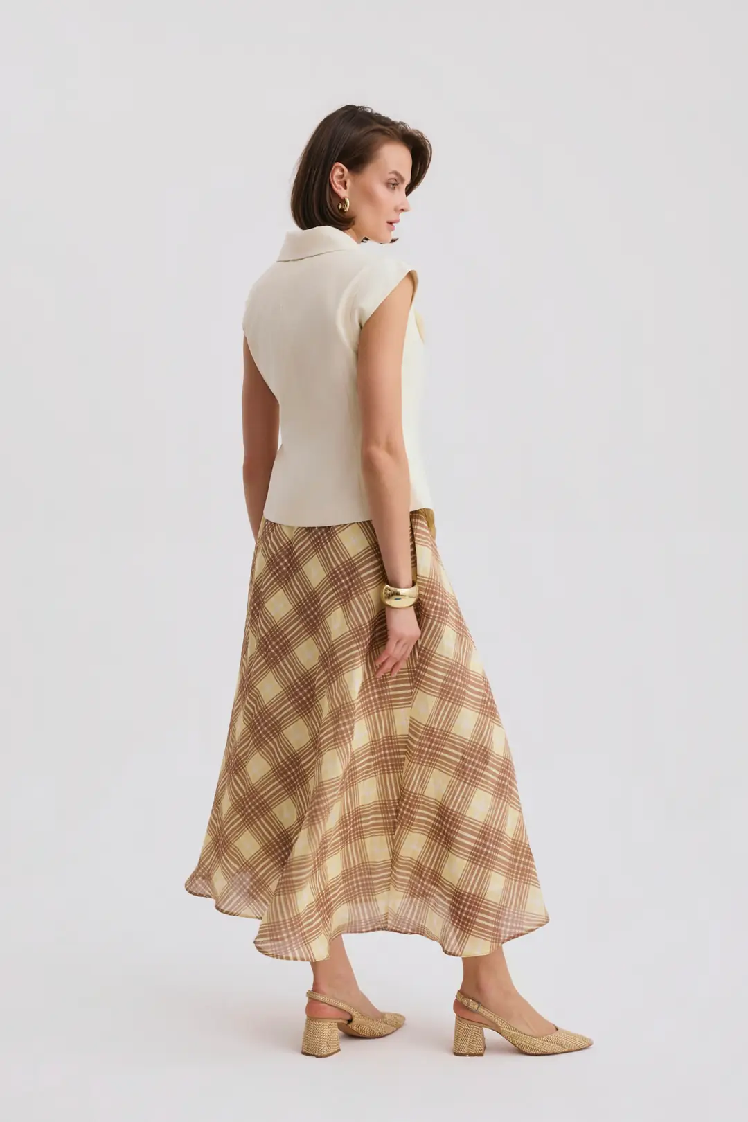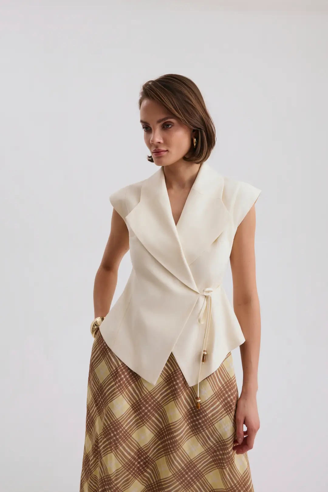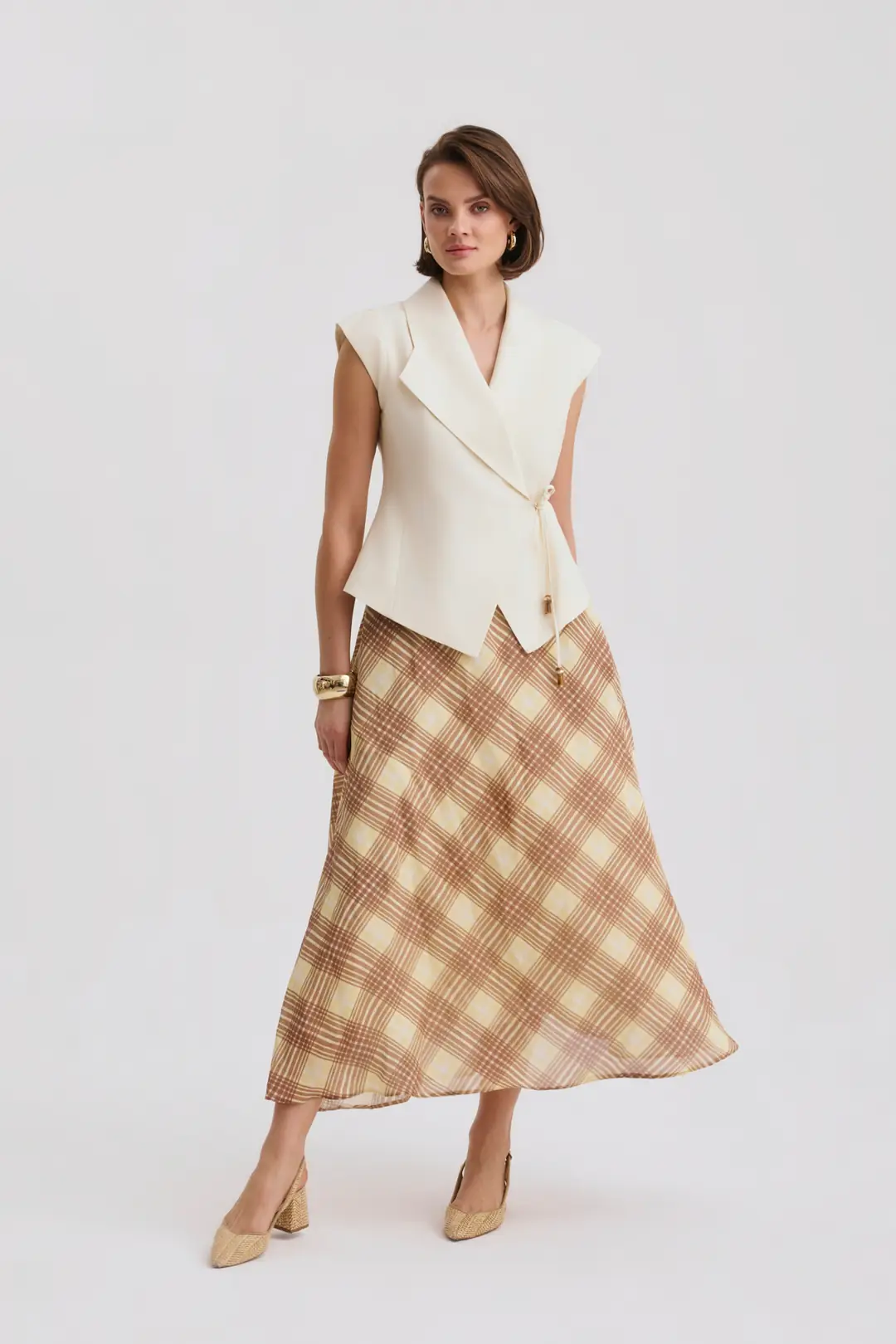 Modern çizgilerle tasarlanan bu takım, zarif ve dengeli bir siluet sunarak stil sahibi kombinlerin vazgeçilmez parçalarından biri olur. Üst parçanın güçlü omuz formu ve bağlama detayı tasarıma modern bir dokunuş katarken, alt parçanın akıcı formu hareketli ve feminen bir görünüm sağlar. Günlük şehir stilinden özel davetlere kadar farklı ortamlarda rahatlıkla tercih edilebilecek şık ve dikkat çekici bir tasarımdır.