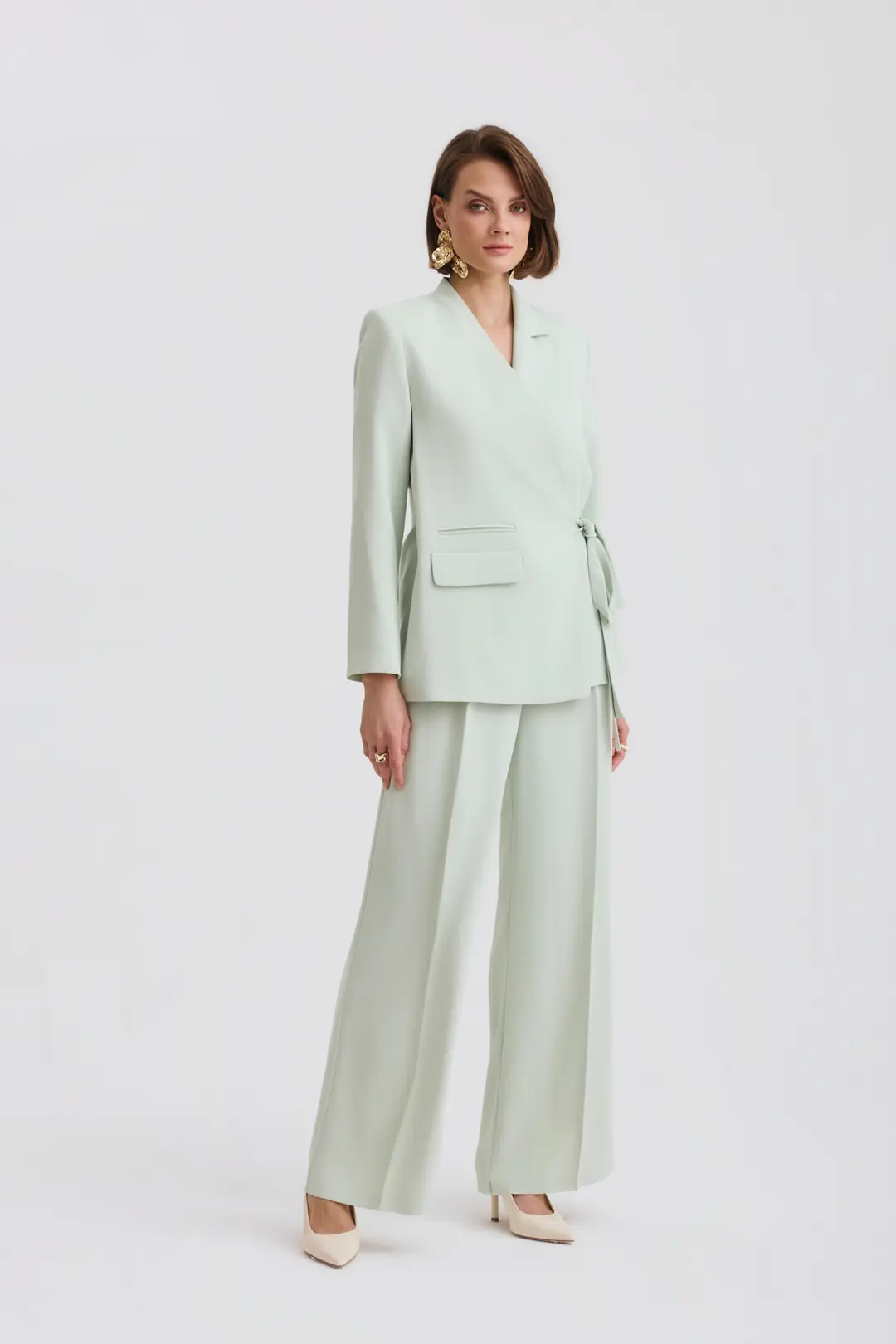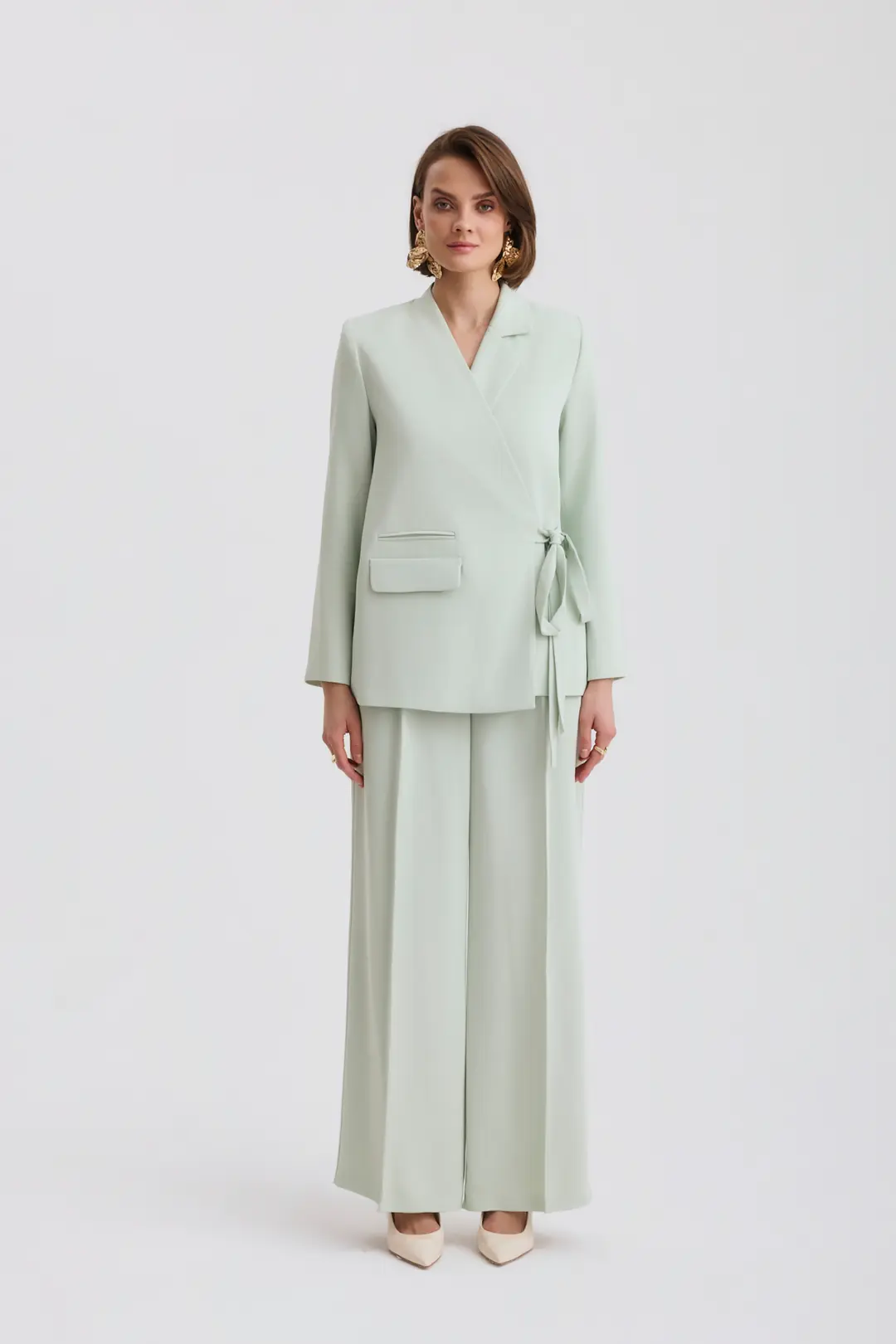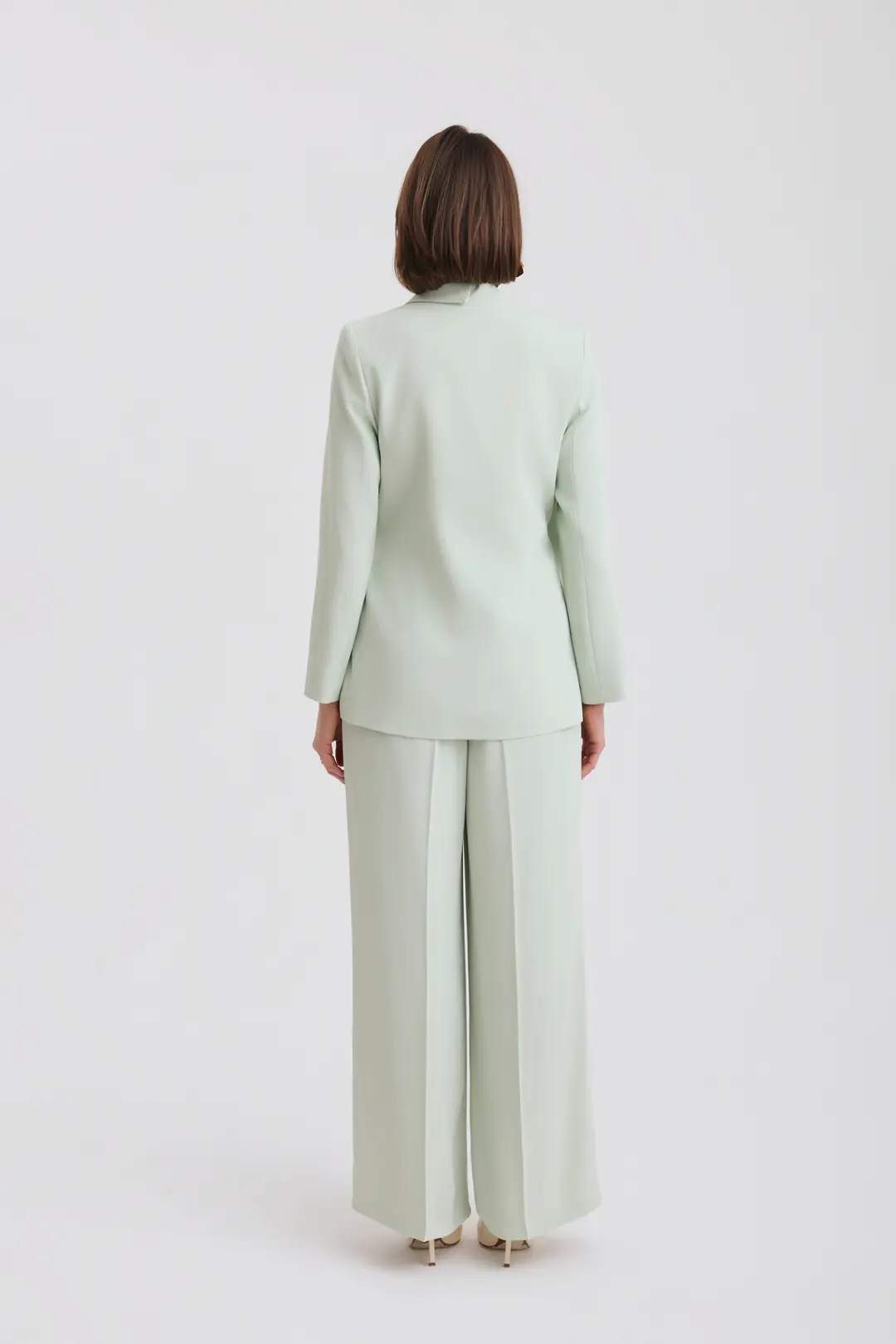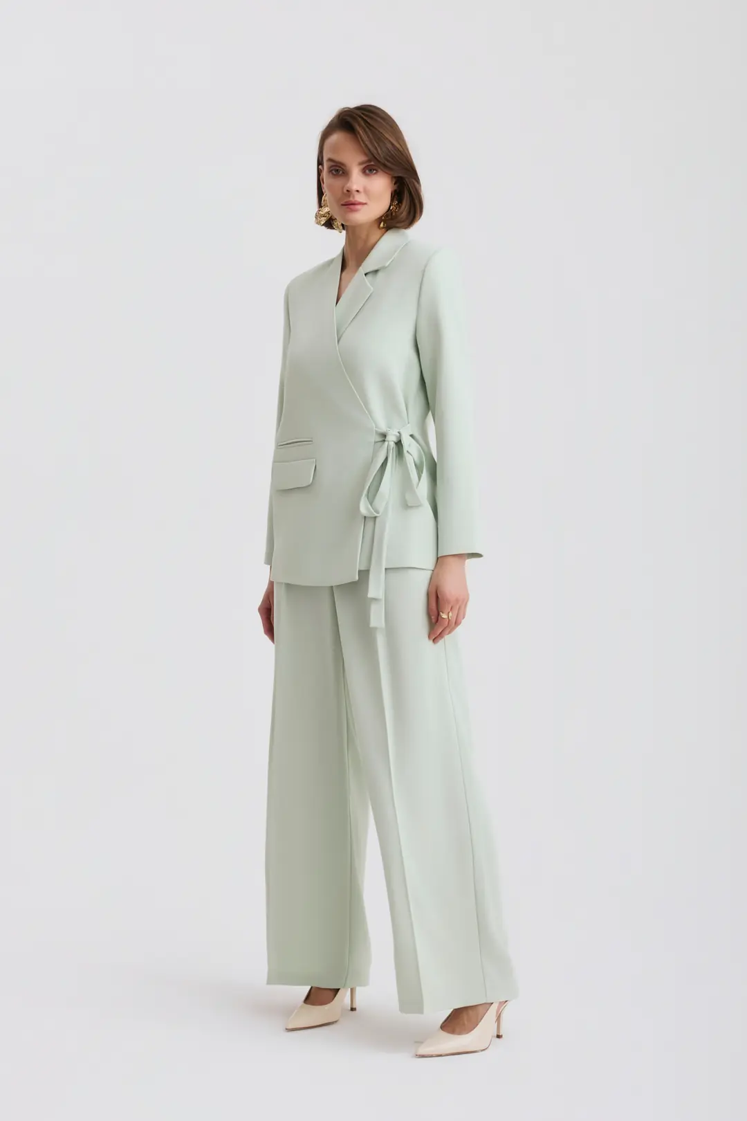 Modern ve zarif tasarım çizgileriyle öne çıkan bu takım, güçlü ve sofistike bir stil arayanlar için ideal bir seçenektir. Dengeli kesimi ve akıcı formu sayesinde vücuda zarif bir siluet kazandırırken gün boyu konforlu bir kullanım sunar. Üst parçanın modern formu ve bel detayı tasarıma feminen bir dokunuş katarken, geniş paça pantolon hareket özgürlüğü sağlayarak şık bir duruş oluşturur.