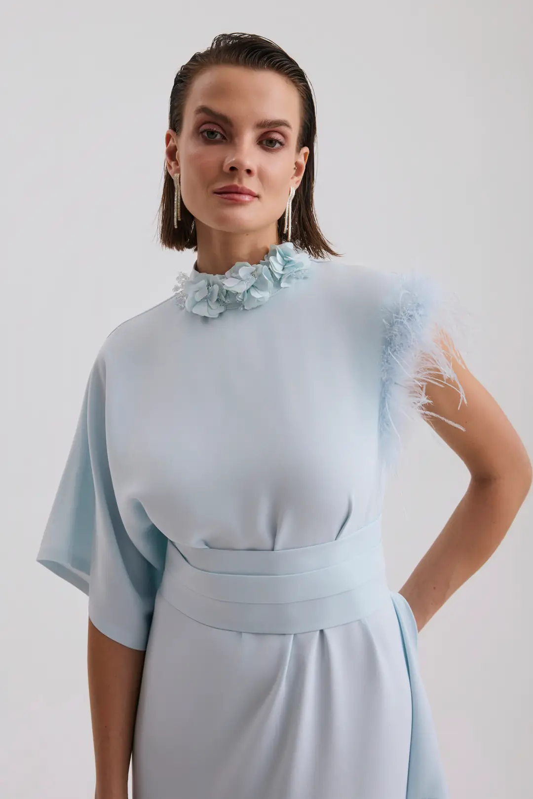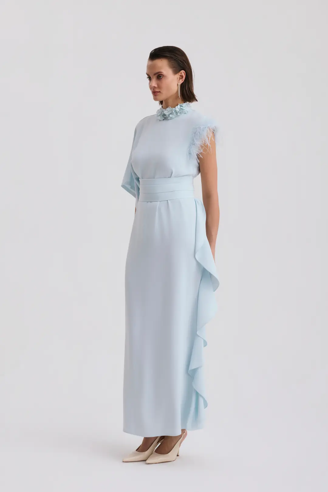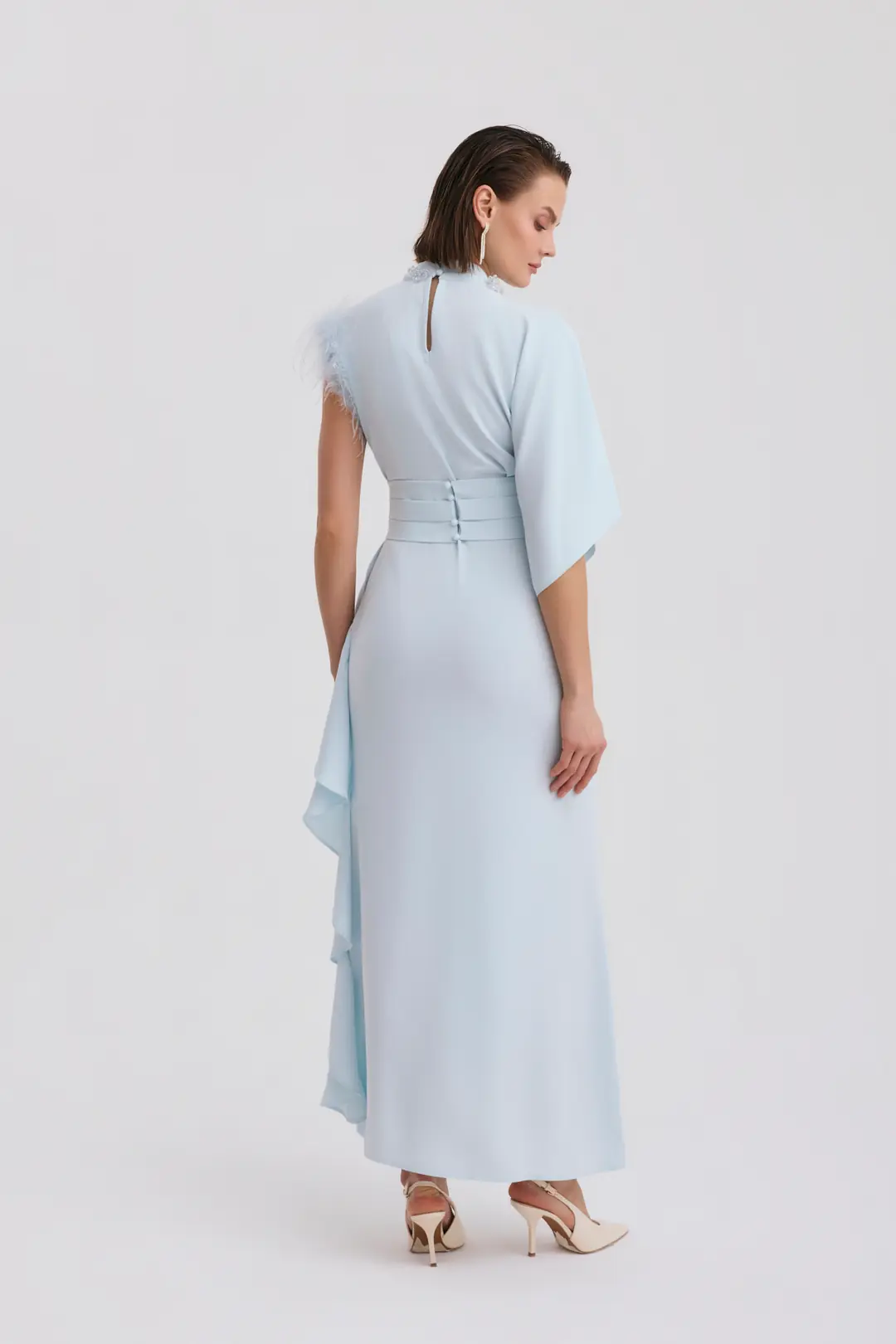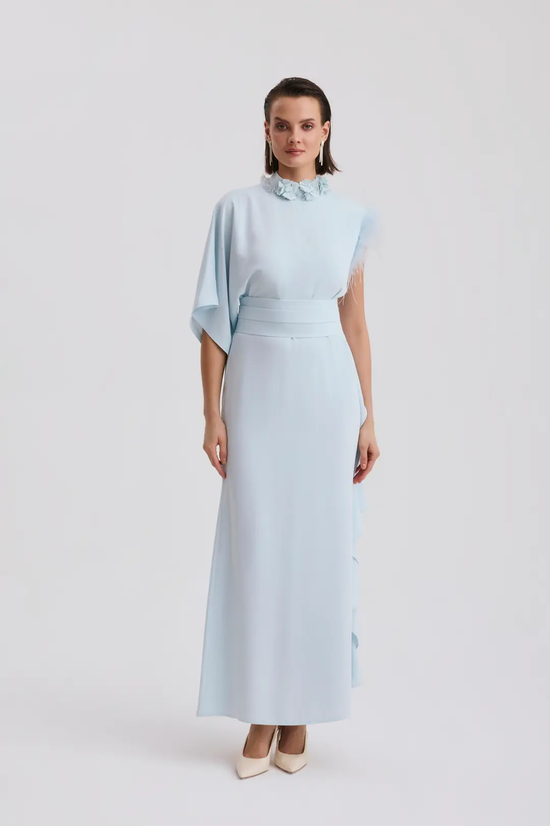Bel kısmındaki geniş kemer formu vücut hatlarını dengeli şekilde vurgularken, tek omuzdan dökülen geniş kol kesimi modern ve mimari bir görünüm sunar. Etek bölümündeki asimetrik katman detayı ise hareketli ve akıcı bir siluet oluşturur.
