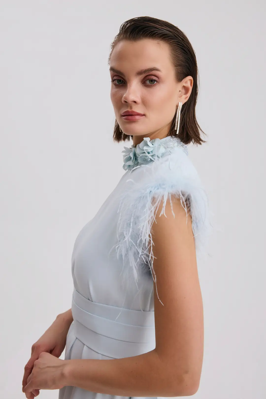 Yüksek yaka çiçek aplikeli tasarım