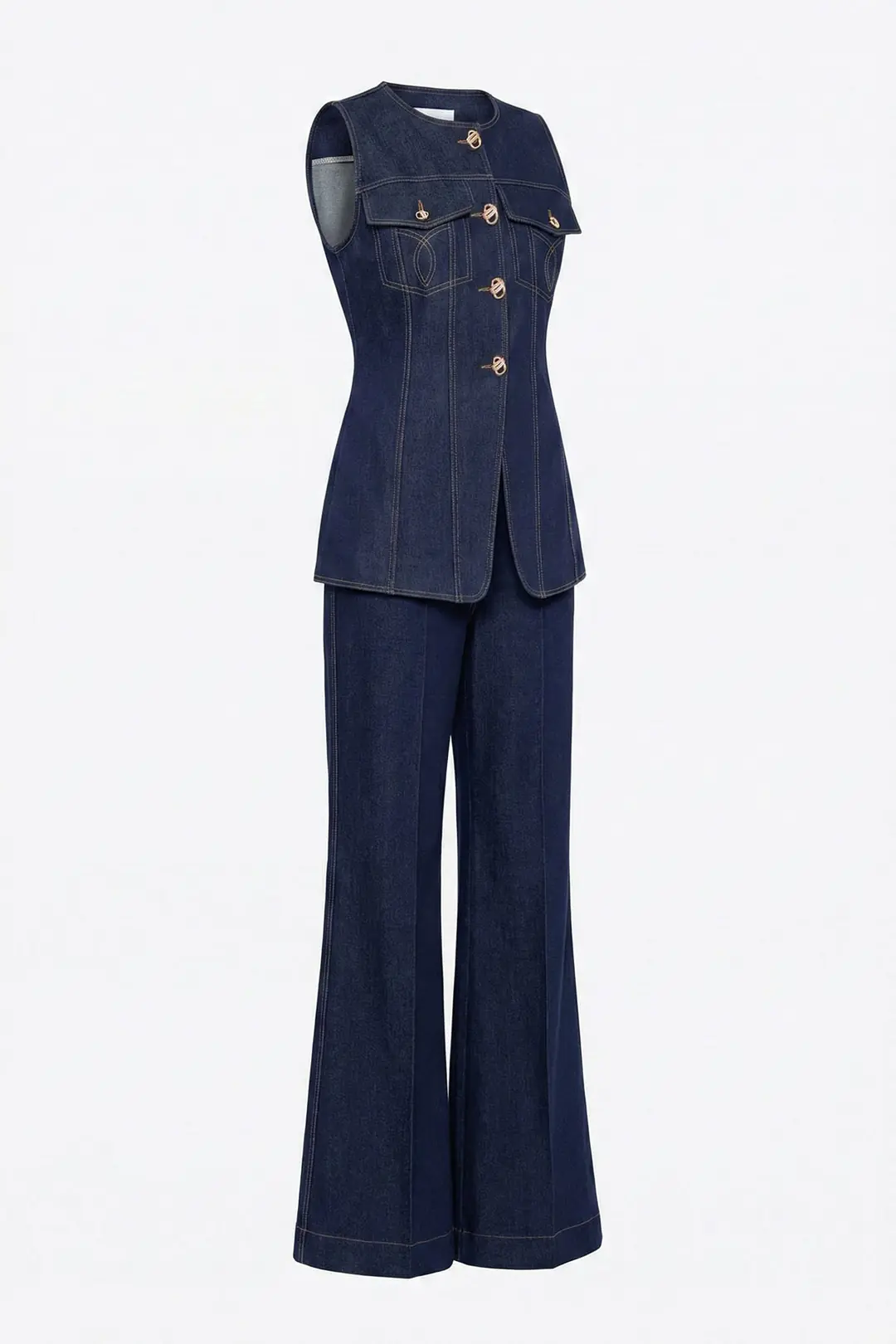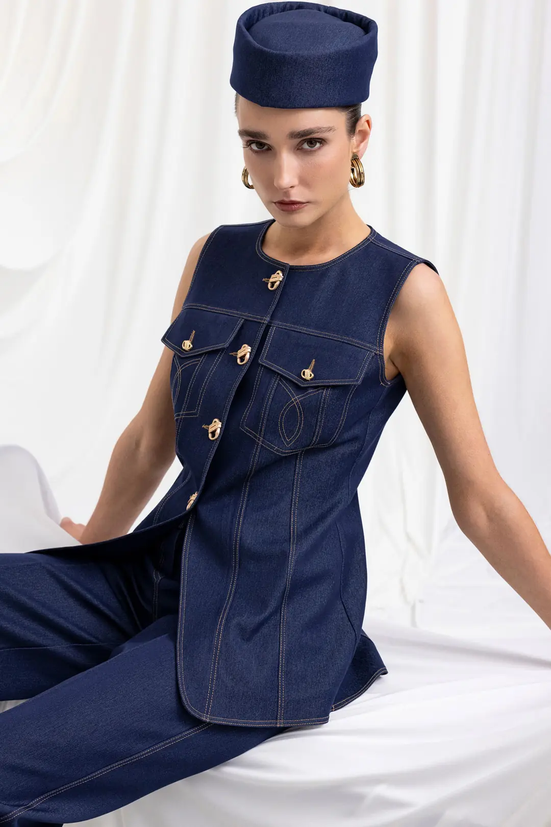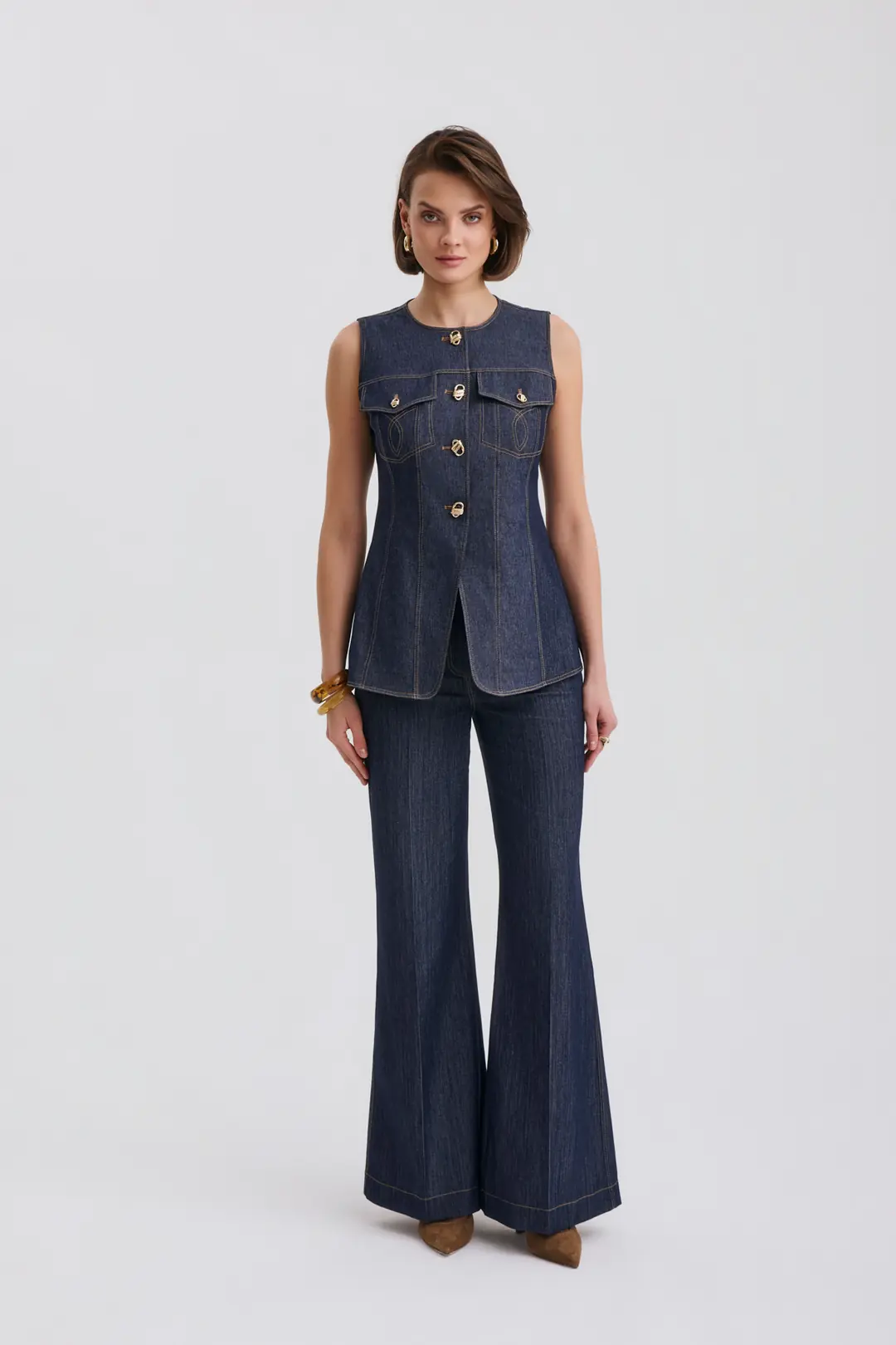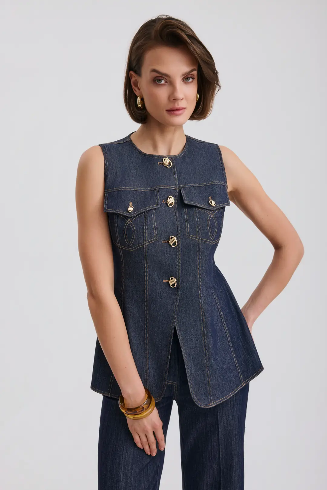 Modern ve iddialı tasarımıyla öne çıkan gold düğme detaylı kolsuz denim yelek ve yüksek bel bol paça pantolon takım, güçlü bir stil arayanlar için tasarlandı. Yapılandırılmış formu sayesinde vücuda oturan yelek modeli, ön bölümde yer alan metal düğme detayları ve cep kapak tasarımıyla dikkat çeker. Kontrast dikiş detayları tasarıma dinamik ve modern bir hava katar.