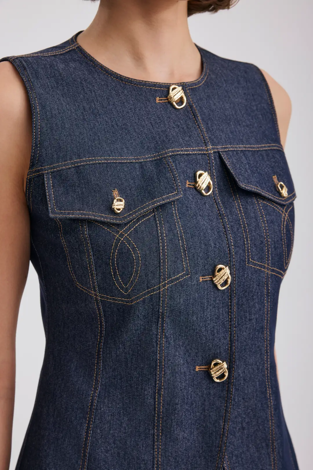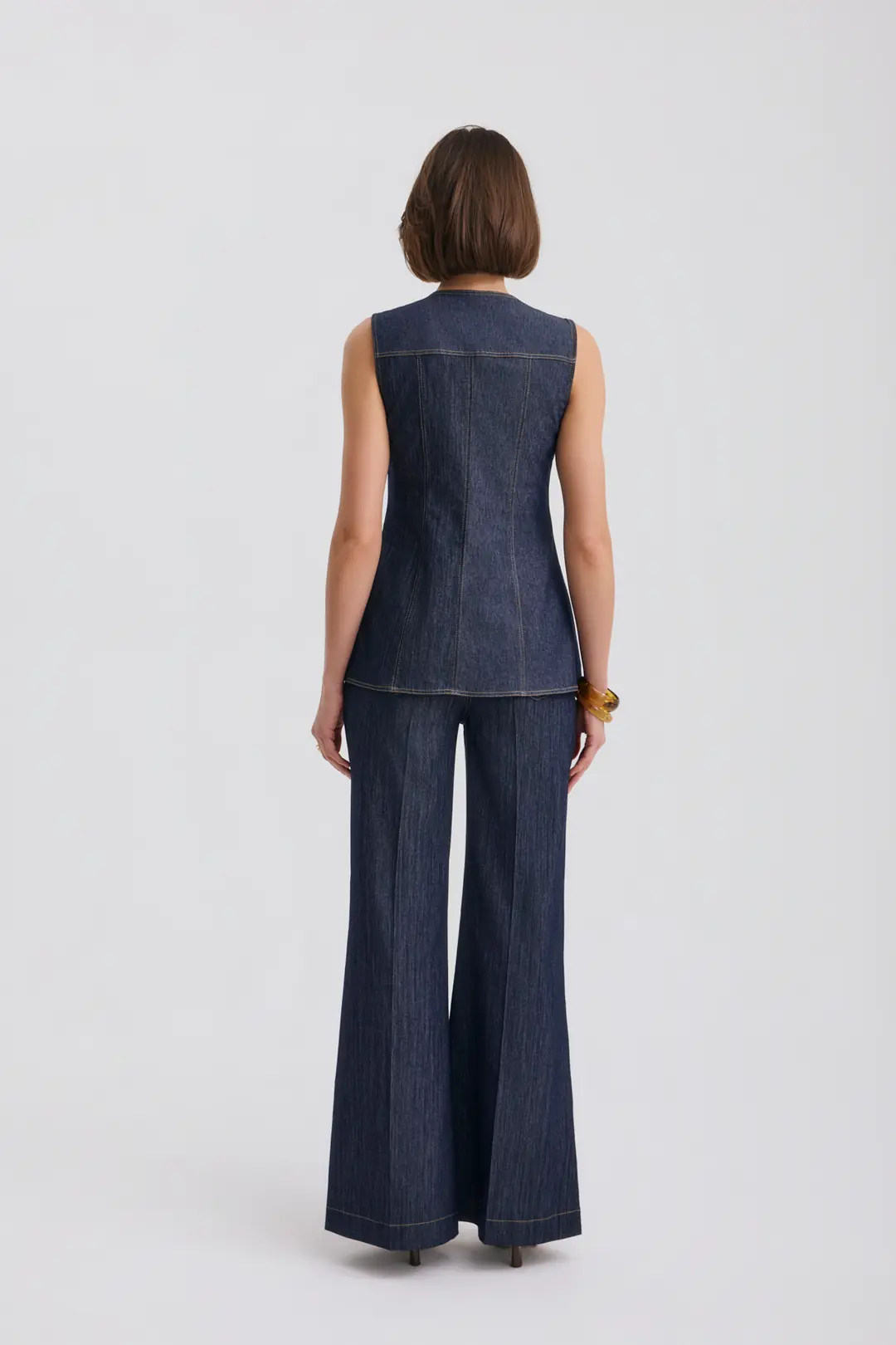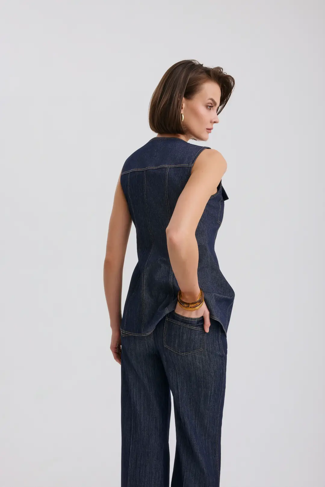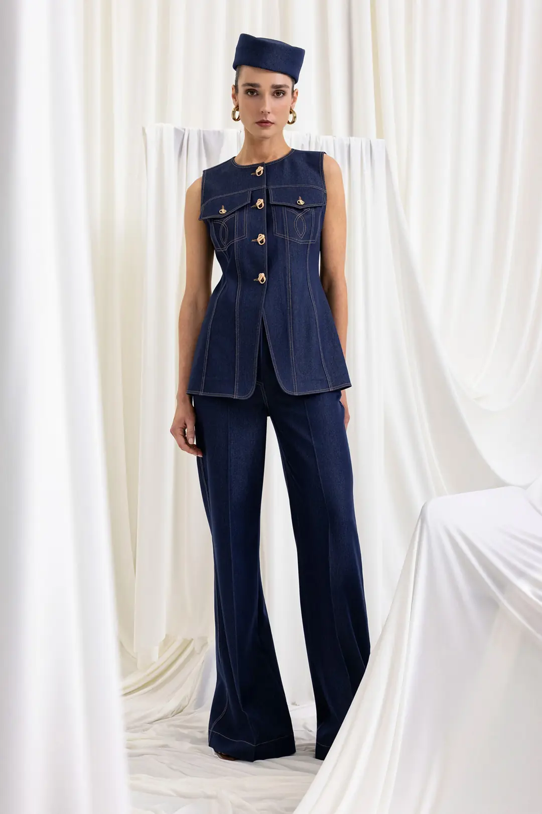 Modern ve iddialı tasarımıyla öne çıkan gold düğme detaylı kolsuz denim yelek ve yüksek bel bol paça pantolon takım, güçlü bir stil arayanlar için tasarlandı. Yapılandırılmış formu sayesinde vücuda oturan yelek modeli, ön bölümde yer alan metal düğme detayları ve cep kapak tasarımıyla dikkat çeker. Kontrast dikiş detayları tasarıma dinamik ve modern bir hava katar.